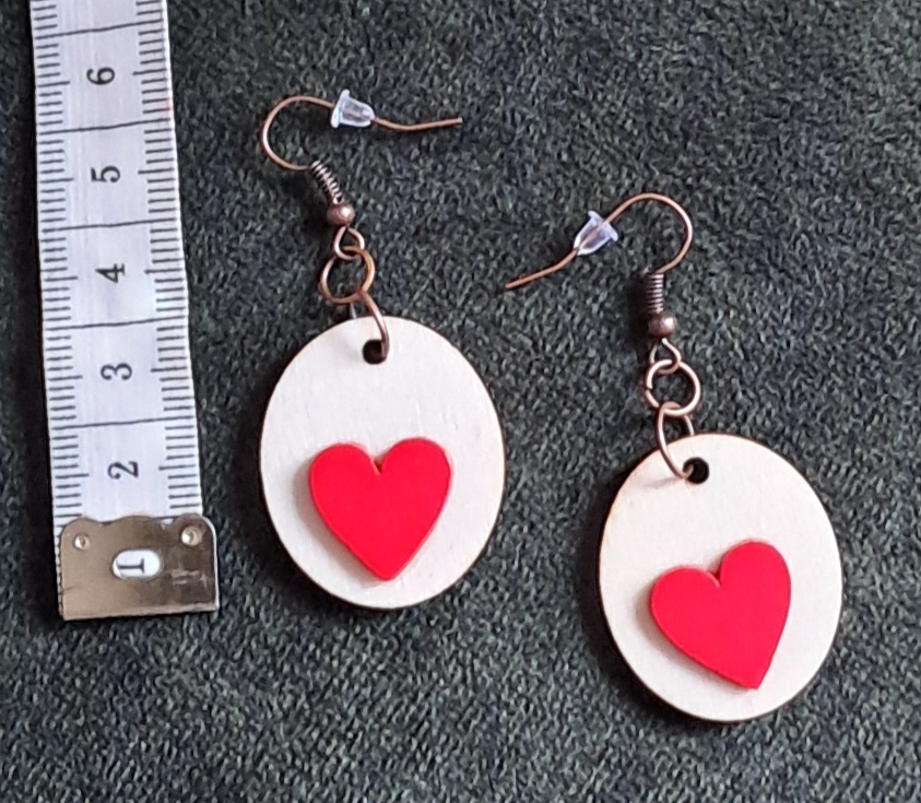 Drevené náušnice s červeným srdiečkom na prednej strane.
