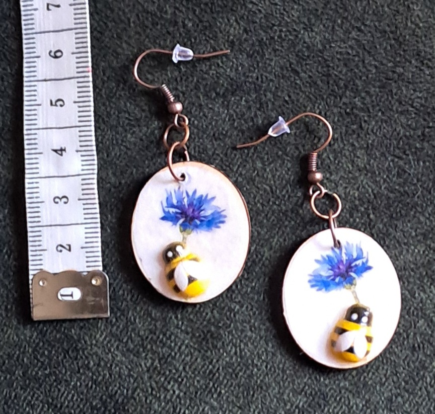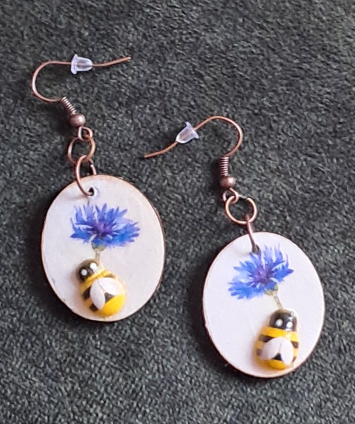 Drevené náušnice Včielky - technika dekupáž. Obojstranné.